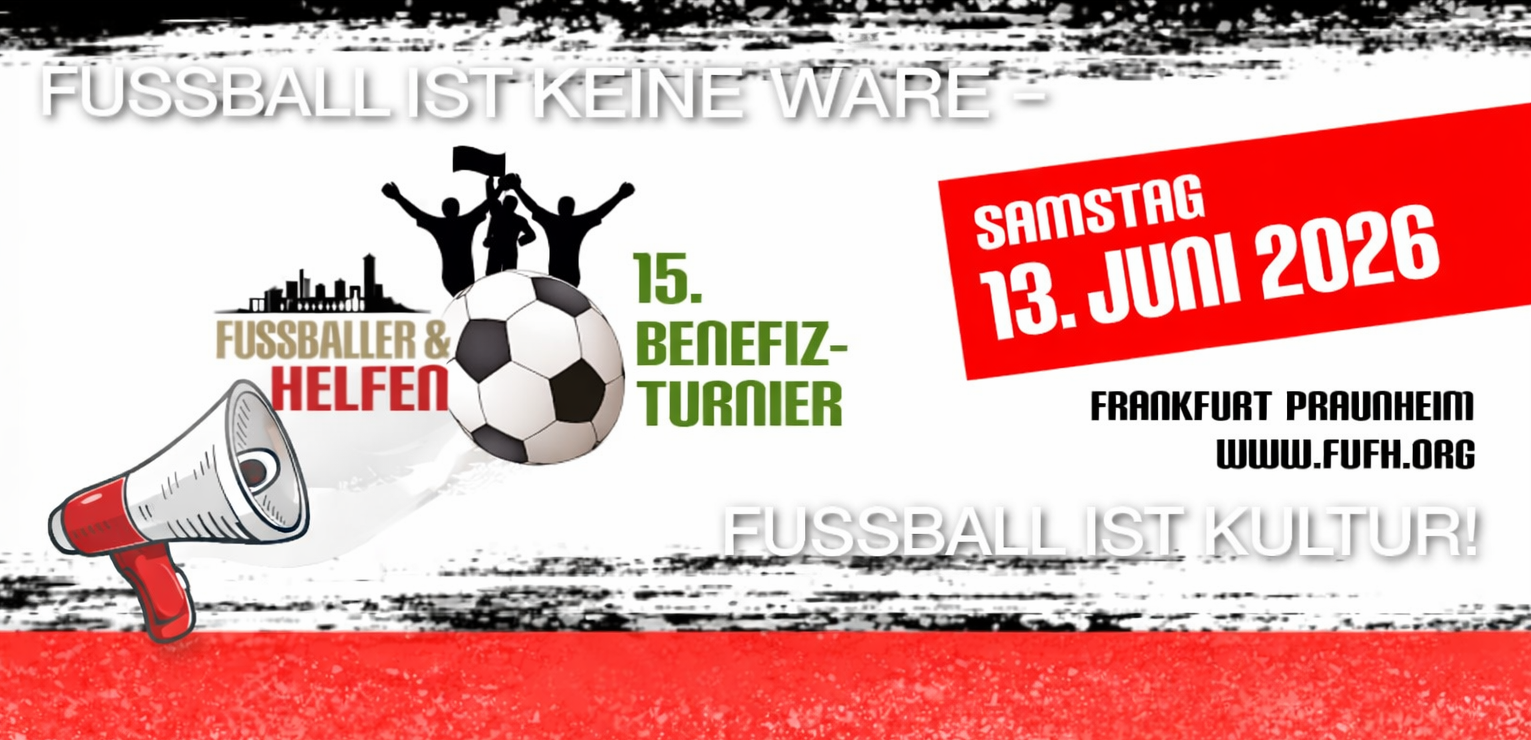 es ist wieder so weit! Das 15. Fußball-Benefizturnier der „Fußballer und Fans helfen e. V.“ steht vor der Tür, und wir würden uns freuen, wenn ihr dabei seid. Das Turnier findet am 13.06.2026 ab 10 Uhr auf dem Sportgelände der SG Praunheim „An der Praunheimer Hohl“ statt. Wir freuen uns auf euch und würden euch gerne am 13.06.2026 auf dem Sportplatz empfangen!